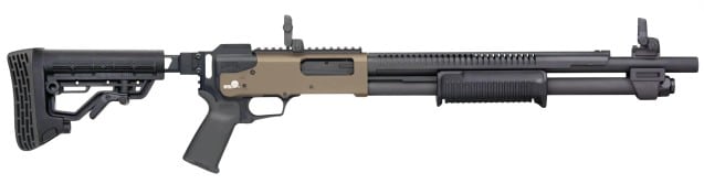 Mossberg & Sons, MFG# 50233, UPC: 015813502337, UOM: EA, 590R, 12 Gauge, 18.5" Barrel, 3", MBUS Adj Sights, Picatinny, Two Tone FDE, Black, 6-rd, MOSS, MOSSLG20, MOSSLGALL, LG20, LGALL