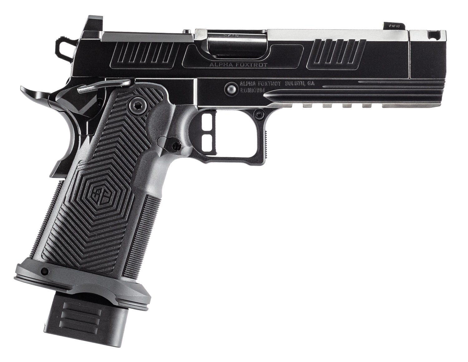 The AF1911 Romulus is hammer fired featuring a SUS416 black polished DLC finish on the frame and slide; Bull ramped, threaded, compensated barrel; injected polymer grip module; extended beavertail, Double Stack magazine; glowing night sights; extended slide release: flared magwell; Picatinny rail; RMSC optics cut; ambi thumb safety. Includes a 17rd and 20rd magazine.