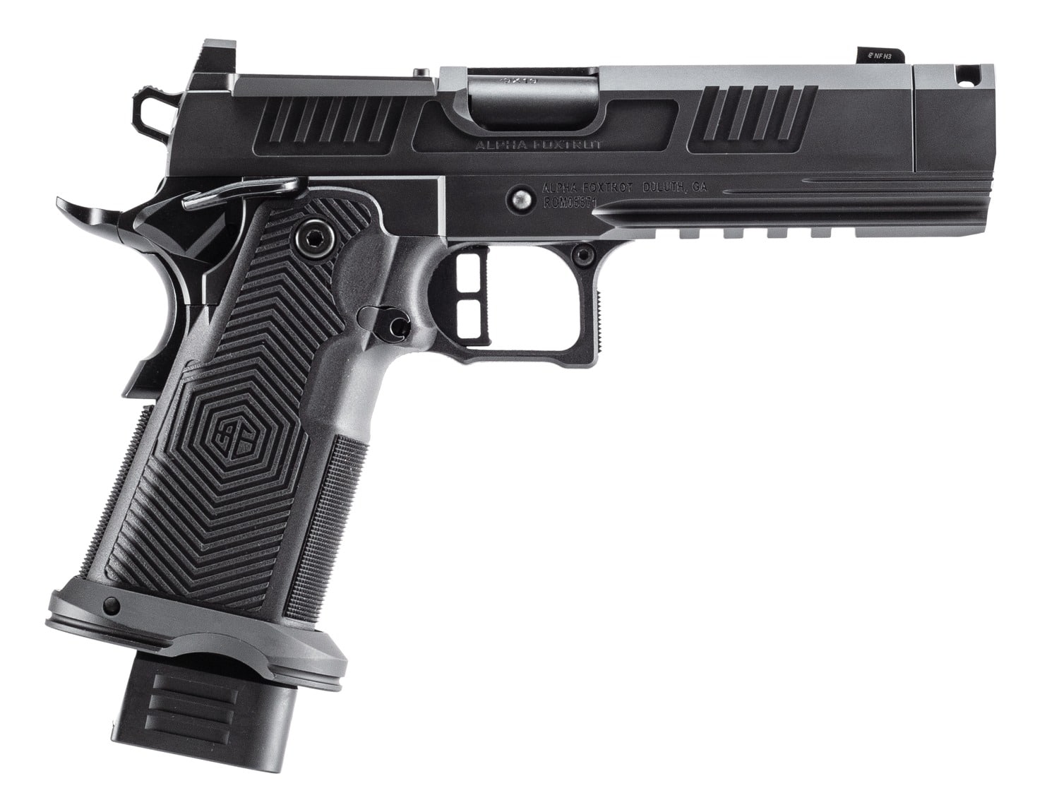 The AF1911 Romulus is hammer fired featuring a SUS416 black polished DLC finish on the frame and slide; Bull ramped, threaded, compensated barrel; injected polymer grip module; extended beavertail, Double Stack magazine; glowing night sights; extended slide release: flared magwell; Picatinny rail; RMSC optics cut; ambi thumb safety. Includes MOS adapter plate, RMSC and RMR plate, 17rd and 20rd magaine.