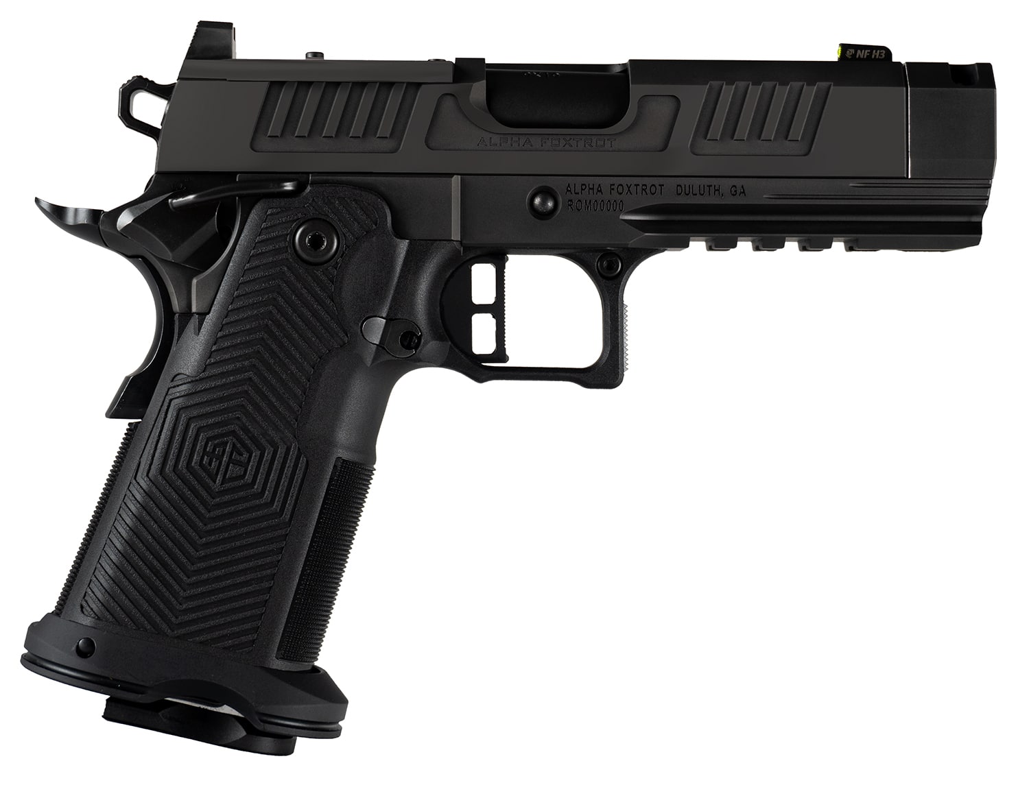 The AF1911 Romulus is hammer fired featuring a SUS416 black polished DLC finish on the frame and slide; Bull ramped, threaded, compensated barrel; injected polymer grip module; extended beavertail, Double Stack magazine; glowing night sights; extended slide release: flared magwell; Picatinny rail; RMSC optics cut; ambi thumb safety. Includes MOS adapter plate, RMSC and RMR plate, 17rd and 20rd magaine.