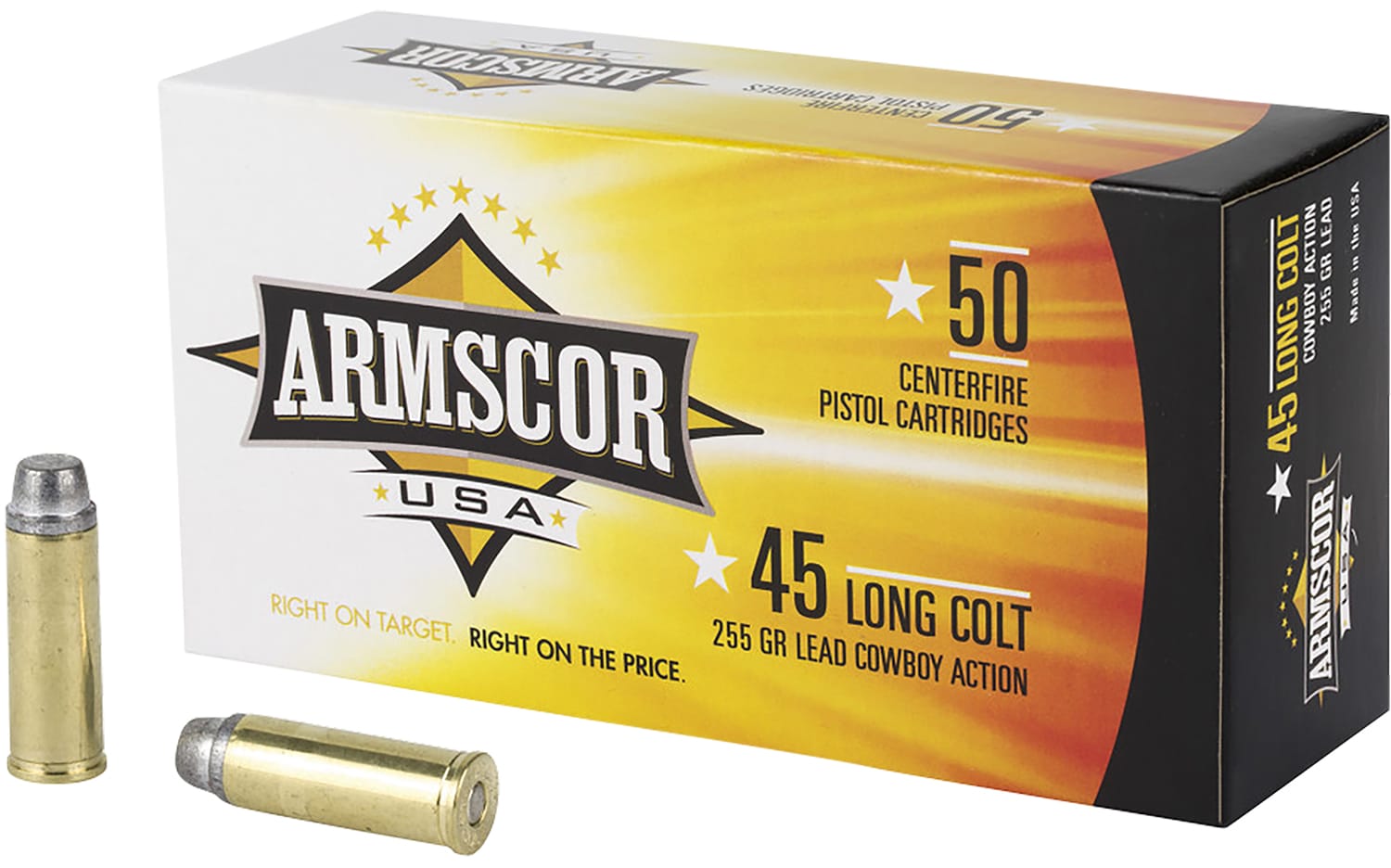 ARMSCOR USA cartridges and components are widely used by the police, military, gun hobbyist, combat shooters, and other shooting enthusiasts due to their high quality, precise and dependable performance. Specifications: 45 Colt (LC)/225 gr/ 800 fps/Lead 50 Per Box/8 Cs