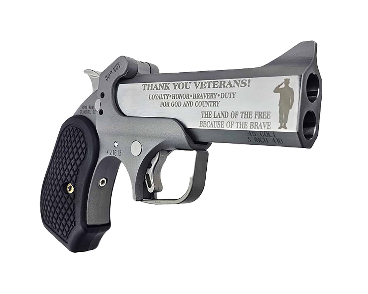Bond Arms BA30THVET-45LC/410 30th Vet 45 Colt (Long Colt)/410 Gauge 2 Shot 4.25″ Engraved Matte Barrel, Rough Matte Stainless Steel Frame, Black Grips