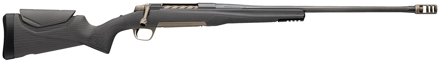 The Browning X-Bolt 2 Pro SPR premium bolt-action hunting rifle for big game. Features a carbon fiber stock with adjustable comb; two-tone styling, matte blue barrel and receiver, bronze Cerakote bolt, bolt handle, bottom metal and Recoil Hawg muzzle brake; spiral fluted bolt; aluminum bolt handle reduce rifle weigh; shorter, spiral fluted barrel with 5/8″-24 muzzle threads is optimized for use with a suppressor. X-Lock Scope Mounting System uses four screws per base for rock-solid attachment to the receiver. Includes Recoil Hawg muzzle brake and thread protector.