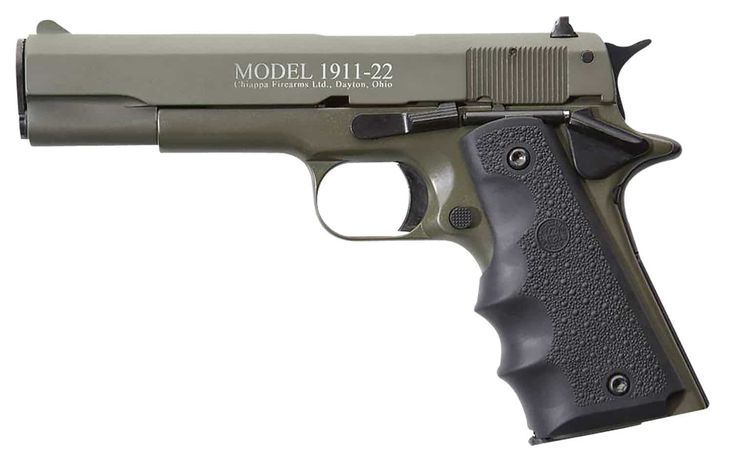 Chiappa Firearms 401121 1911-22 22 LR 10+1 5″ OD Green Serrated Steel Slide & Beavertail Frame, Black Hogue Rubber w/Finger Grooves Grip