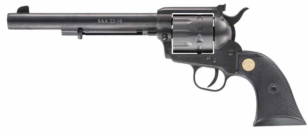 Chiappa Firearms CF340170 SAA 1873 Medium Frame 22 LR 10 Shot, 7.50″ Blued Steel Barrel, Blued Steel Frame, Blued Cylinder, Black Plastic Grip, Exposed Hammer
