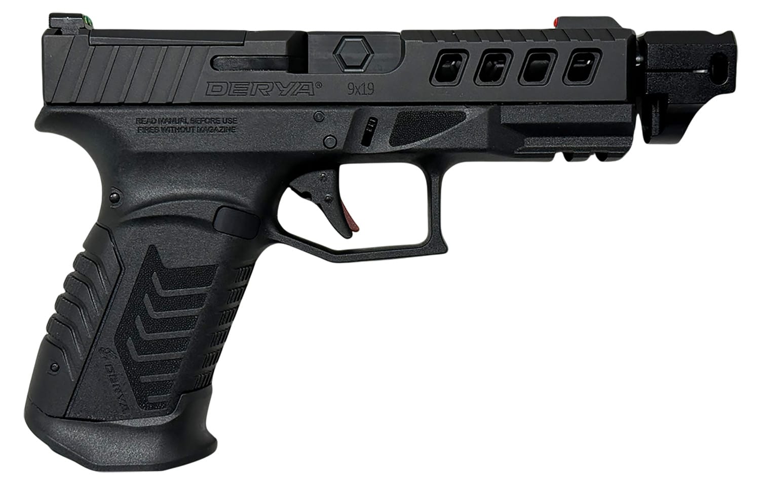 The Derya DY9 COMP is a striker-fired 9mm Luger pistol crafted for unmatched performance. Featuring a 4.64″ threaded stainless steel barrel with a compensator attached to minimize muzzle rise and felt recoil; optic-ready for effortless red dot integration; interchangeable backstraps for a customized ergonomic fit; black Melonite finish ensuring unparalleled accuracy and durability in the harshest conditions. Made in Jacksonville, FL. Includes hard case, magazine, compensator and two optic plates.