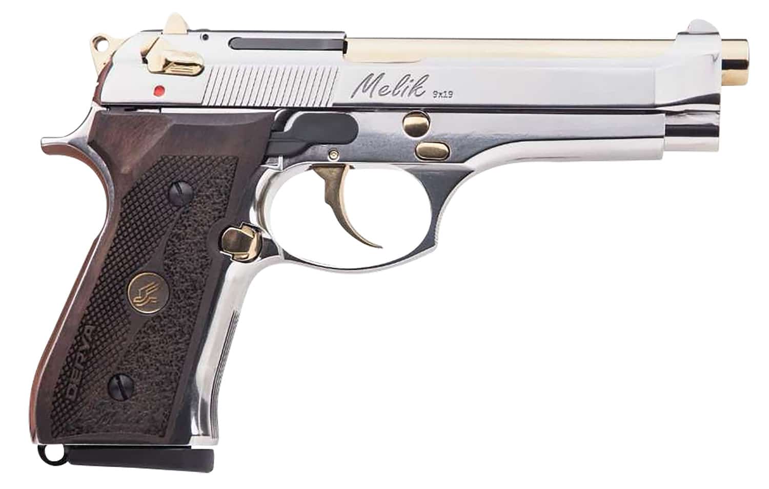 The Melik offers a double action design with a recoil delayed locking block system. Features an aluminum frame, 4140 steel slid; Gold TiN barrel and ambidextrous safety.