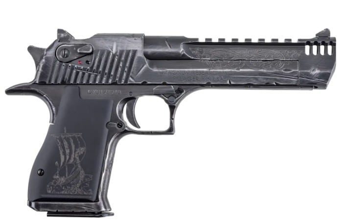 Magnum Research, MFG# DE50VK1, UPC: 761226091110, UOM: EA, Desert Eagle Mark XIX, .50 AE, 6″ Barrel, Engraved Viking Ship Aluminum Grips, Distressed Grey, 7-rd, MAGN, MAGNHG10, MAGNHGALL, HG10, HGALL