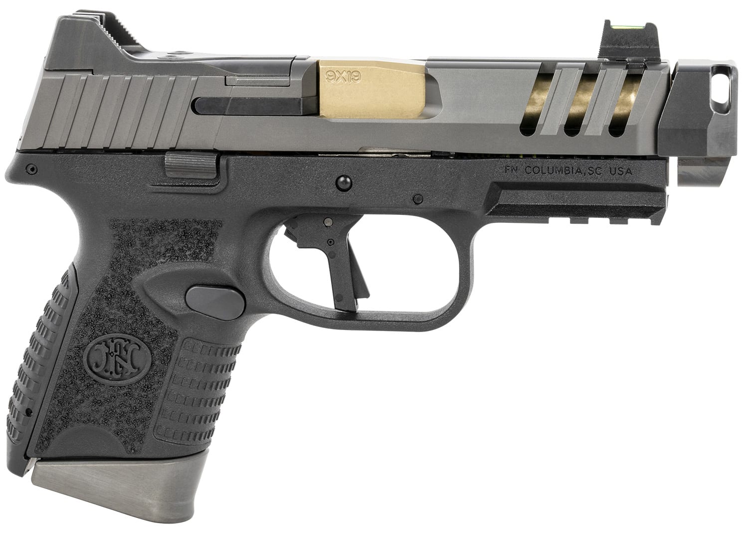FN 66101350 509 CC Edge 9mm Luger 10+1 (3) 4.20″ Threaded Gold Barrel, Black Frame, Graphite Optic & Lightening Cut Slide, Optic Height Fiber Optic Sights, Compensator (No Manual)