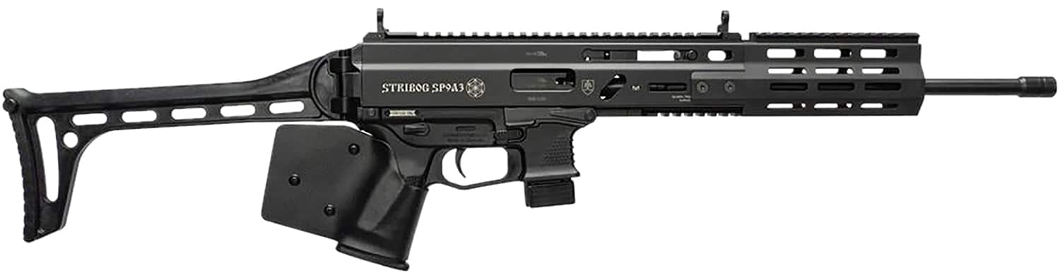 Grand Power Stribog 9mm Luger, 16″ barrel, direct blowback, featureless paddle and Mil-Spec AR trigger. Includes three 10rd magazines.
