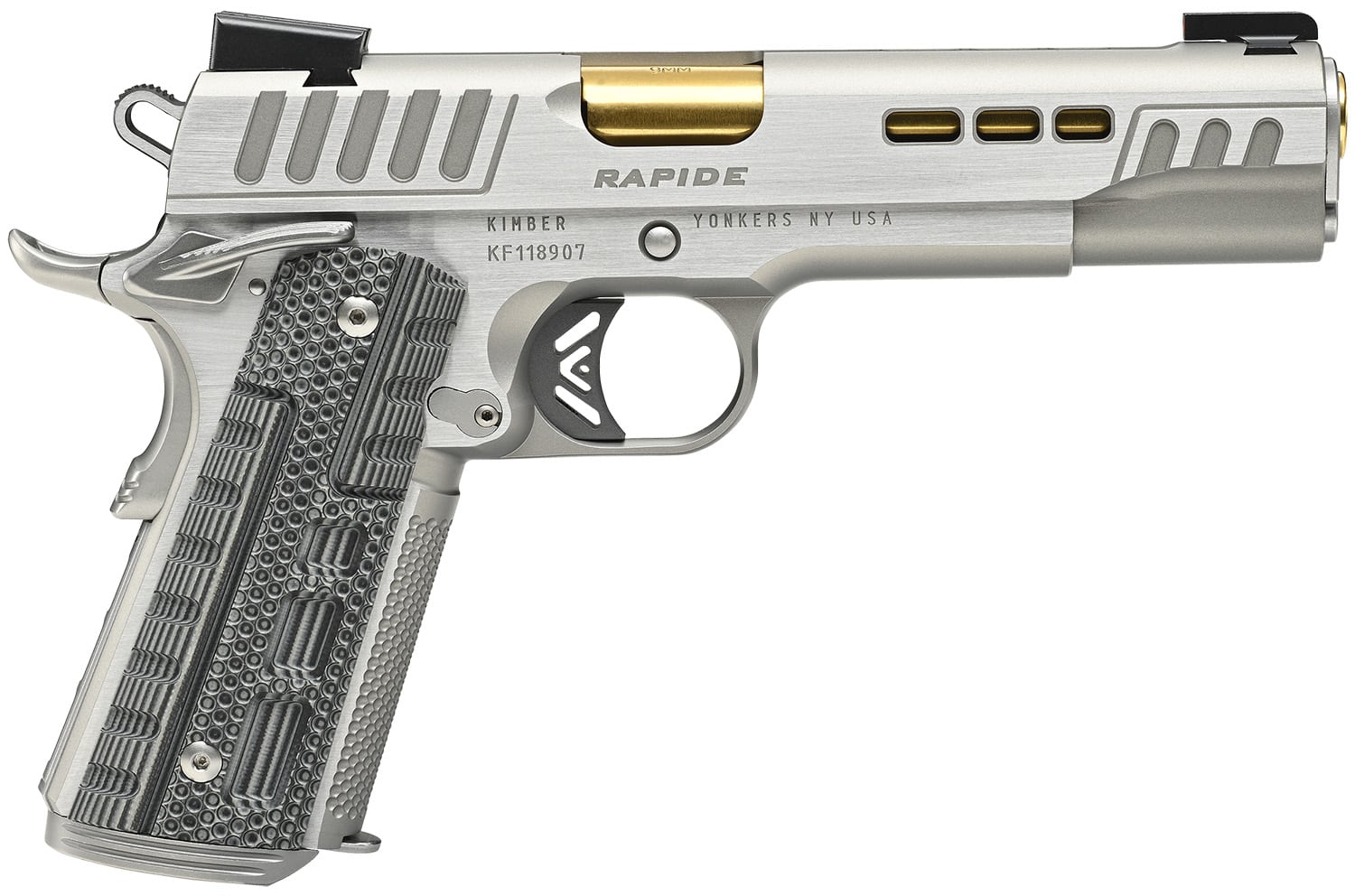 The RAPIDE(DAWN) (DN,NS). A truly unique 1911 with stepped cocking serrations, slide lightening cuts for faster Slide lock-up and TiN coated barrel for extreme durability. Equipped with Kimber Stiplex TM front strap stippling and Gray/Black G10 Rapide patterned grips for extra griping confidence.