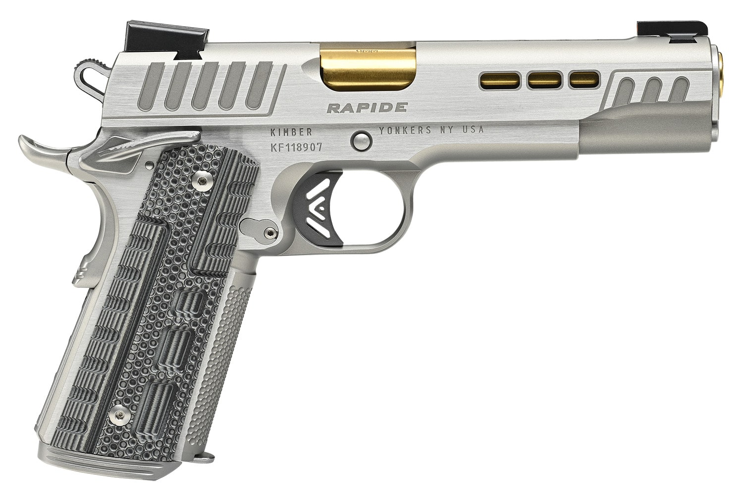 The RAPIDE(DAWN) (DN,NS). A truly unique 1911 with stepped cocking serrations, slide lightening cuts for faster Slide lock-up and TiN coated barrel for extreme durability. Equipped with Kimber Stiplex TM front strap stippling and Gray/Black G10 Rapide patterned grips for extra griping confidence.