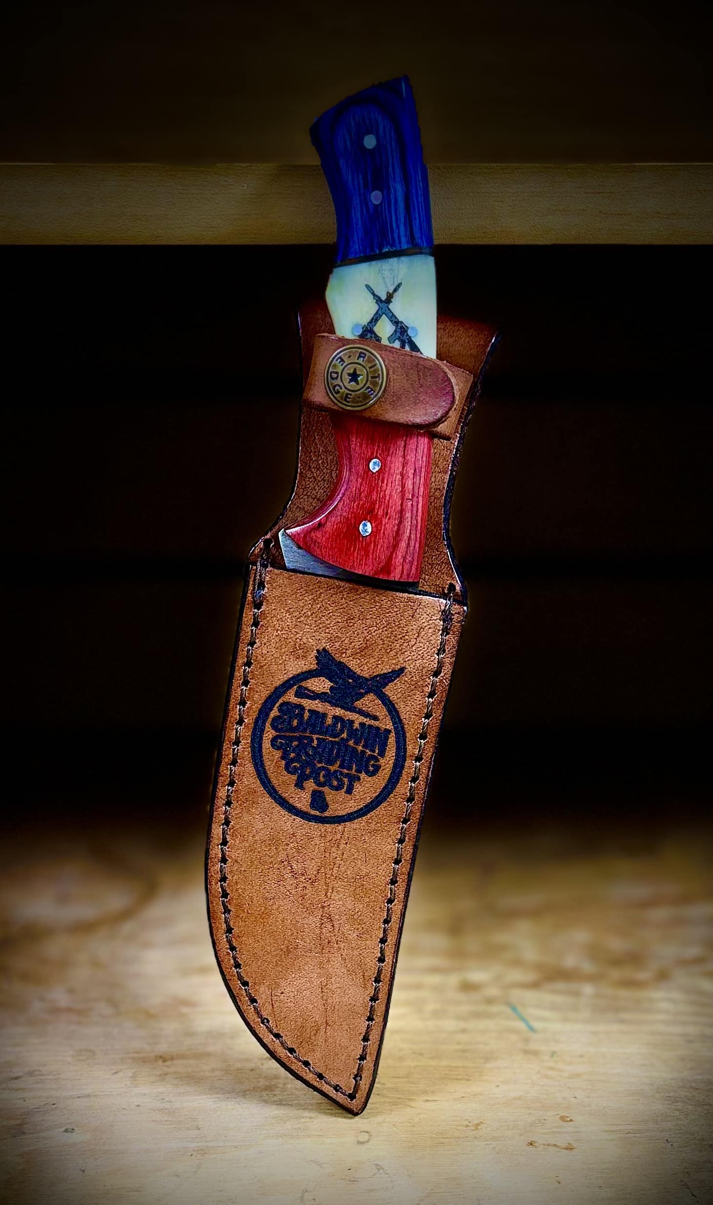 We are excited to offer for the first time ever our exclusive Baldwin Trading Post Hunting Knife in our custom leather sheath with our logo, these knives are handcrafted by local knife maker in Banks County Georgia. we like keeping our Business local So when you buy our exclusive knife, you’re not only supporting one local business but two local businesses and getting a high-quality amazing knife for only $35 …. so what are you waiting for ?
