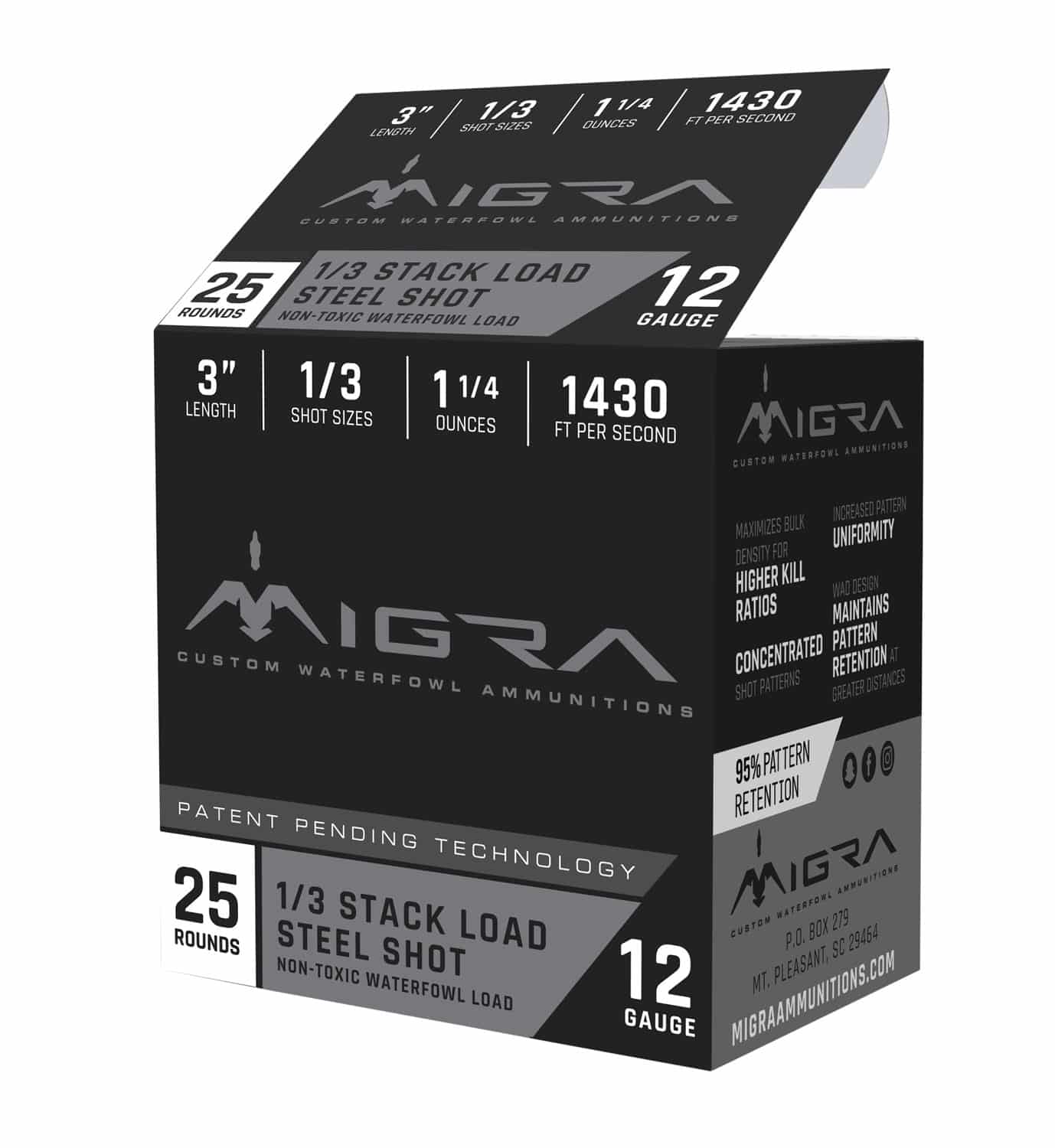 Migra Staxd Load is the answer to multiple hunting situations. The engineered formula delivers uniform patterns and consistent bulk densities that deliver increased kill-ratios with absolutely no fillers. Combined with our patent-pending technology and carefully selected shot combinations Migra shells are deadly and reliable.