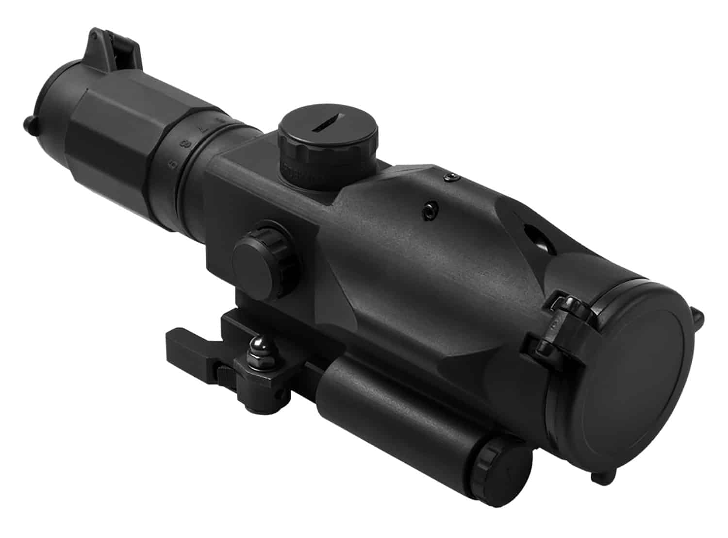 The SRT 3-9X variable magnification rubber armored scope with a 40mm objective lens features a fully integrated Green Laser on top of the scope body. Top mounted fully adjustable Green Laser: 532nm, Max output <5mw, Class IIIA Laser. The Electronic Control Panel adjust the brightness level of the illuminated P4 reticle, changes the reticle color from blue or red and turns the Laser On/Off. There are five brightness settings for the Illuminated Reticle. The SRT whole Ocular body functions as a large magnification ring. There is also an adjustable reticle focus ring at the end of the ocular lens. Low Profile Elevation Turret with a Bullet Drop Compensator (BDC) calibrated for M193 55gr. FMJ Mil-Spec ammo. AR15/ M4 1" scope centerline height. Integrated Auto Locking Quick Release Mount, fits Weaver/ Picatinny/ MIL-STD 1913 type rails. Features a redesigned and more compact lever, integrated flip-up lens covers. Includes two AA batteries.