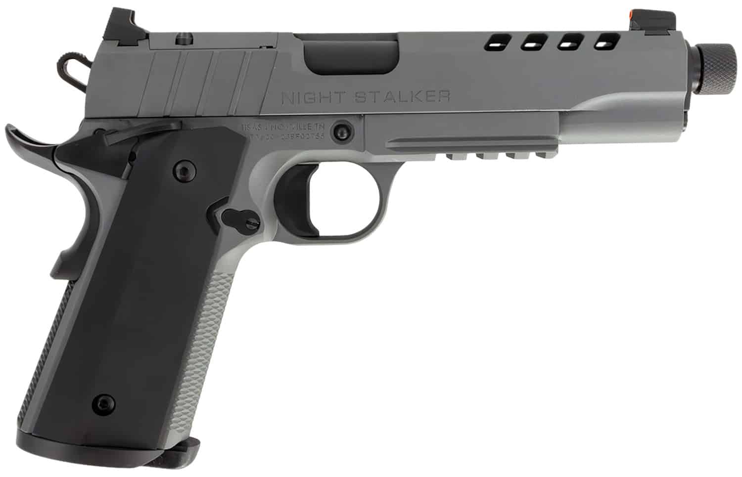 The Nightstalker is a full-size 1911 pistol with an integrated Picatinny Rail that comes from the factory with a long list of features that include a double stack magazine, skeletonized hammer, lowered and flared Ejection Port, SF trigger, titanium firing pin, ambidextrous safety, black solid trigger, extended beavertail grip safety, aluminum grips and rear slide cocking serrations. Built on our forged, front checkered frame and slide for durability with our cold hammer forged threaded barrel for accuracy. Includes two magazines, cleaning kit, lockable rugged case.