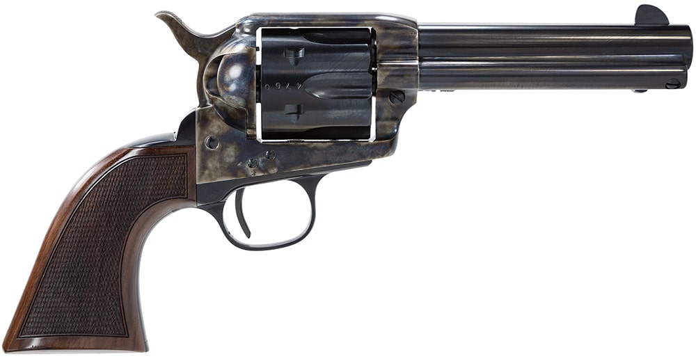 The Smoke Wagon Deluxe from Taylor’s & Company is a second-generation, stagecoach-style, single-action revolver with a forged frame. It boasts a low-profile hammer and wider-style sights to allow the user to acquire sights faster, without forcibly cocking the pistol. It features a blued barrel and cylinder with a case-hardened frame, and a thin, richly-detailed, checkered grip for comfort and improved aim. In addition, these deluxe editions include custom tuning; custom hammer and base pin springs; 3 lb. trigger spring; jig cut, positive angles on the trigger and sear for crisp, reliable action; a coil-loaded hand; and wire bolt.